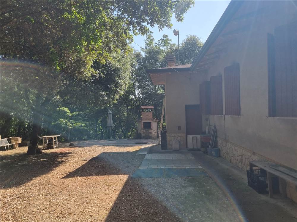 Nelle colline sopra Bettona casa singola con 5.000 mq di terreno immersa nel verde. Su unico livello con accesso indipendente, ampio soggiorno con camino e grande vetrata, angolo cottura e ripostiglio, disimpegno, camera matrimoniale, camera singola, bagno e altra camera matrimoniale con bagno; terrazzi e portico di ingresso. Interamente arredata. La casa è stata ristrutturata nel 2015. Terreno recintato, cancello carrabile di ingresso, corte in parte pavimentata, vasca di raccolta acqua piovana, forno esterno, casetta in legno per attrezzi e legnaia.
